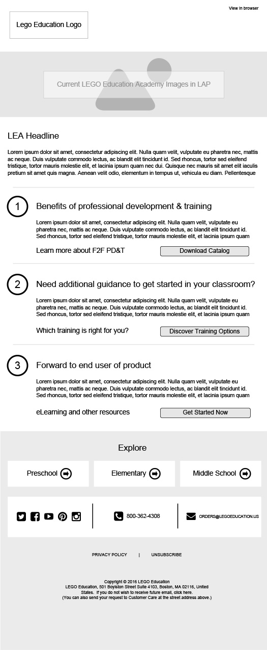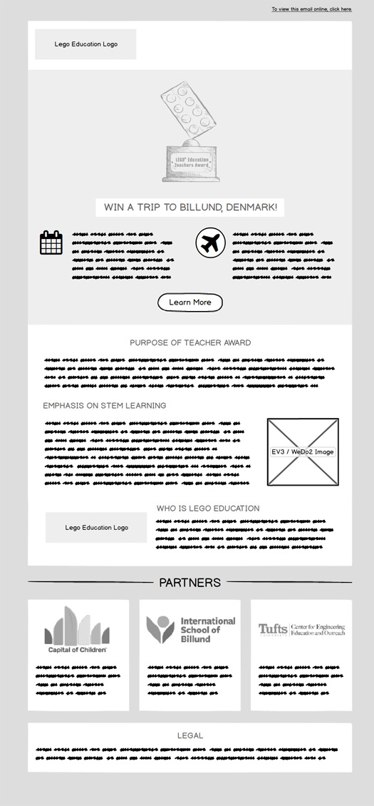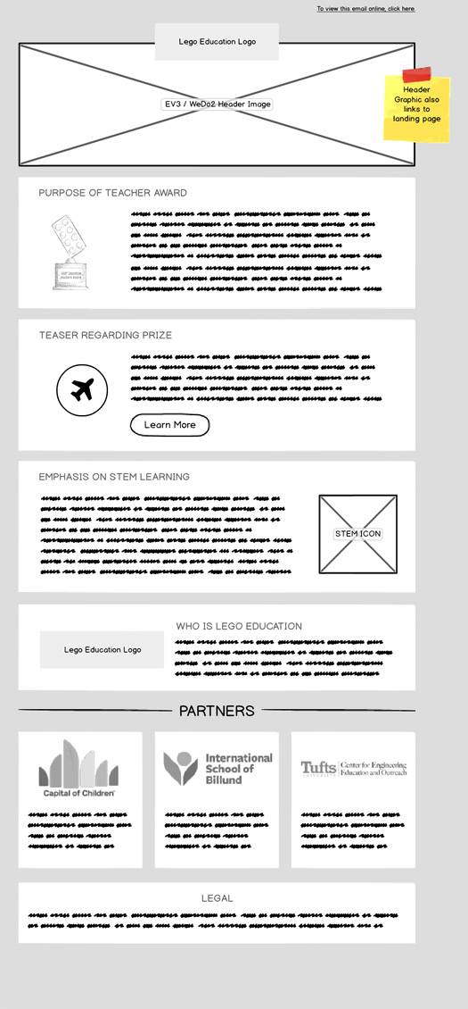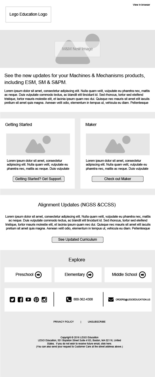 In 2017, I worked with Senior Marketing Managers at Lego Education to redevelop the layouts of their marketing emails. The initial project brief discussed the need for more efficacy in their email pushes, and there were some specific layout issues that needed be dealt with to improve the reception of these emails by customers
