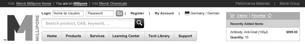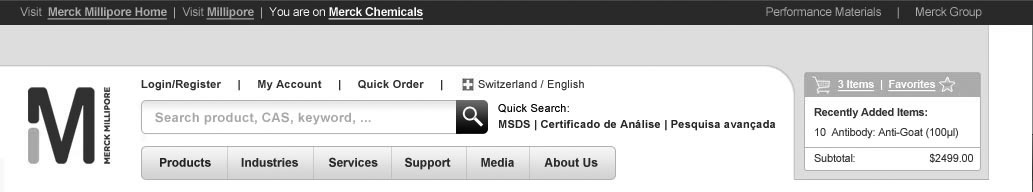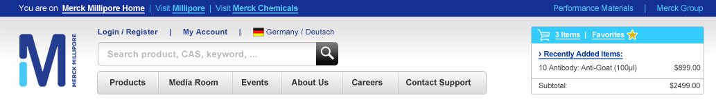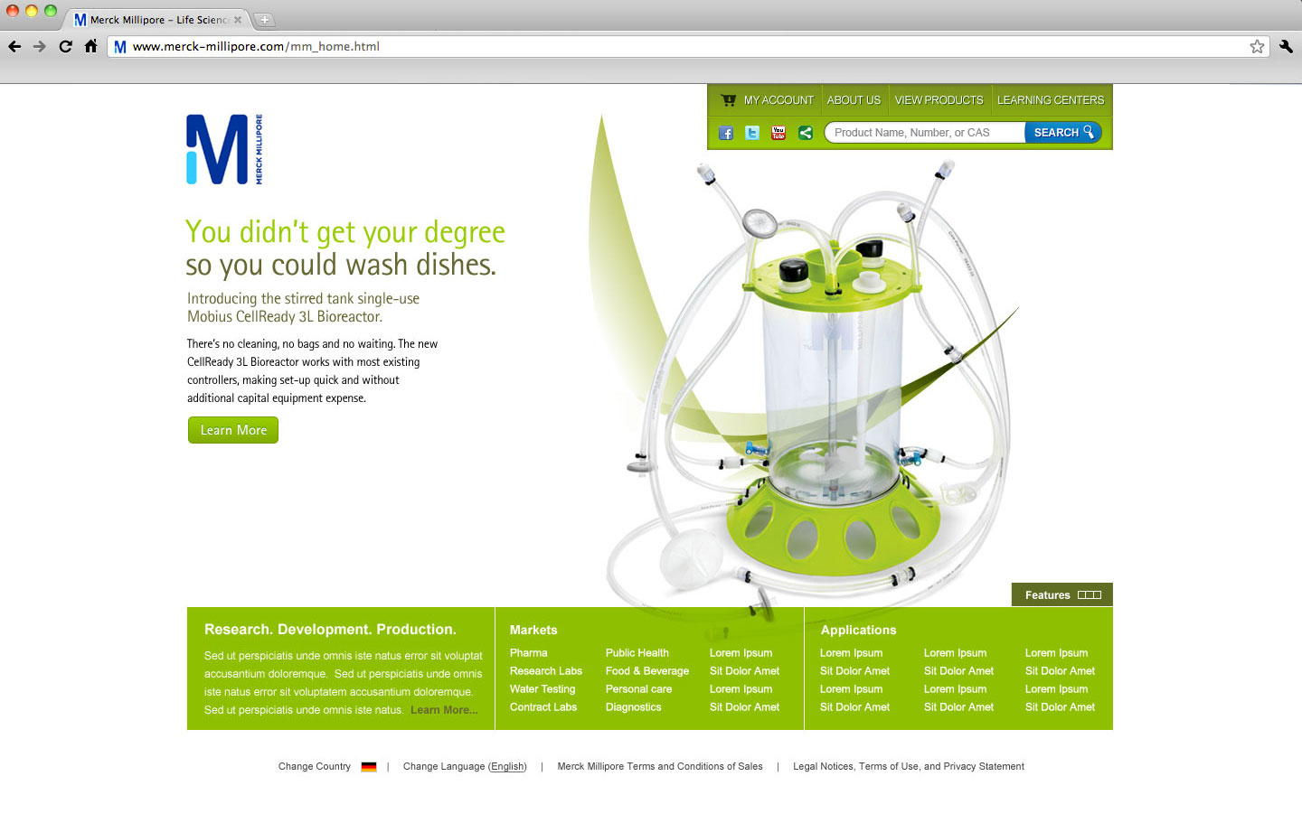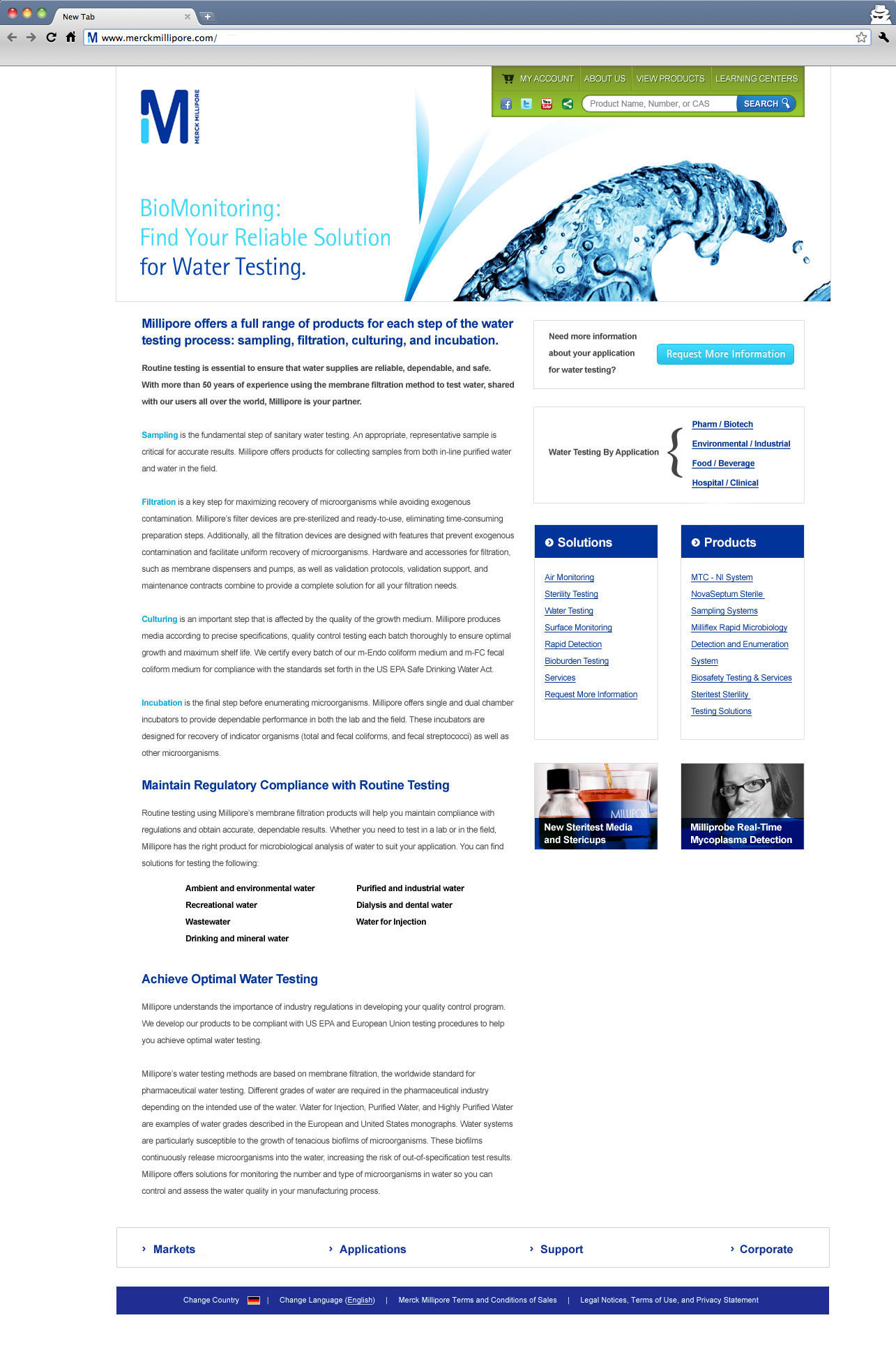 During my time as Interactive Art Director at Millipore, the company was acquired by Merck KGaA, a chemicals company based in Darmstadt, Germany. Because Merck has a legal agreement not to use the 'Merck' name in the US (the company is known as EMD in the US), this introduced a host of nomenclature issues that needed to be handled on the website.