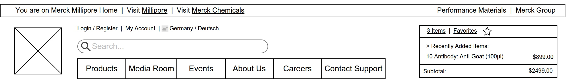 The images below show the legacy Millipore navigation, the legacy Merck navigation, and a proposal of how to combine the two into a cohesive and straightforward experience for customers of this new combined company. This nav was used on an interrim version of merckmillipore.com while a completely new website was built from the ground up.